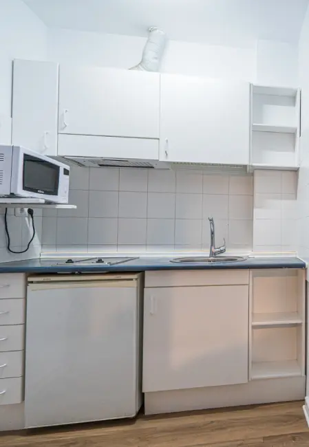 Habitación individual de 19 m2 con cocina, baño privado, escritorio, armario amplio, estantería y calefacción.